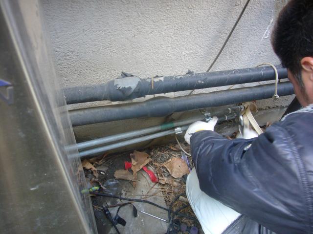 | 保温工事をして、設置完了です。 | 保温工事をして、設置完了です。 | 配管接続のまとめをしながら、リモコンを取り替えて、試運転で確認します。 |