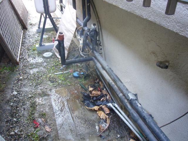 | 給湯器周辺の配管の切り離しです。 | 珍しく、ふろ循環パイプが鉄管でしてありました。 | 施工日は、あいにく雨模様でしたが、無事切り離し搬出です。 |