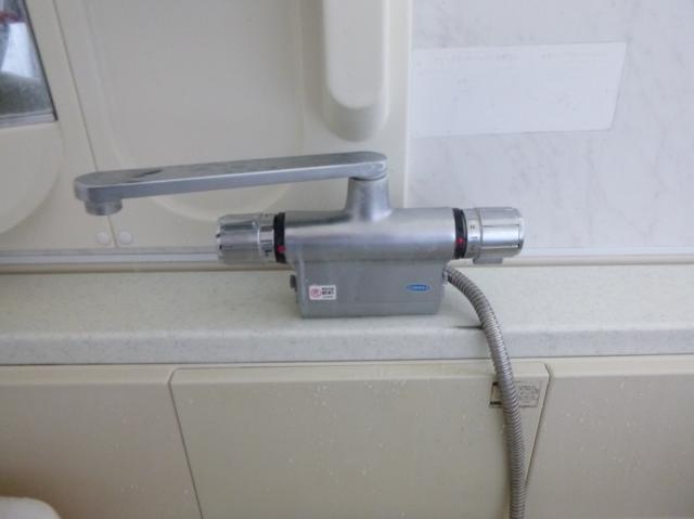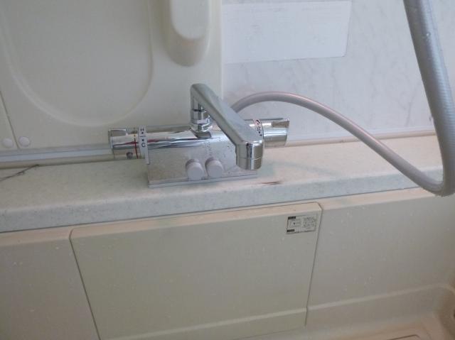 | 給湯器の頭に排気筒が付いていて、すすで壁が汚れるため、トタンでカバーがしてあります。 | セミ貯湯のため、けっこう大きなものです。 | 浴室のサーモ付シャワー水栓の取り替えも一緒に依頼されました。 |