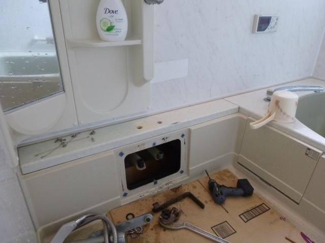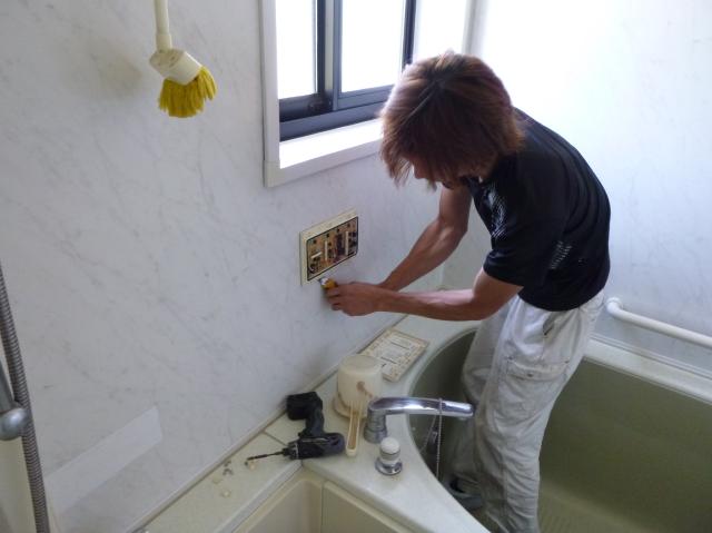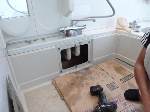 | サーモ付シャワー水栓の取り替えで既存品の取り外し。 | ユニットの内部で接続し完了です。 | ボイラーの試運転で、お湯はりをします。 |