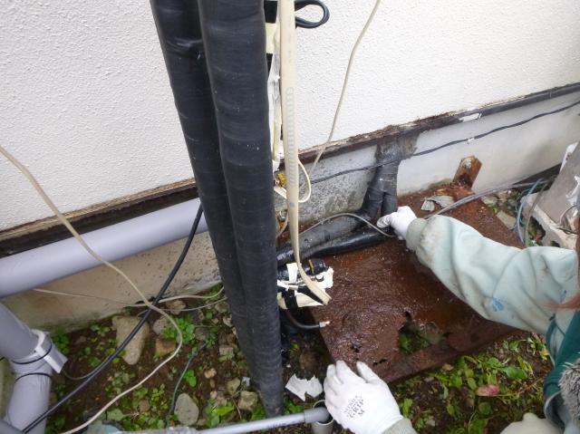 | お客さまのお休みに合わせて、土曜日の施工です。天気予報がよくありません。 | 配管の接続を切り離し本体を取り外し、架台も錆びてボロボロになっていたので一緒に取り替えます。 | 全部撤去しました。 |