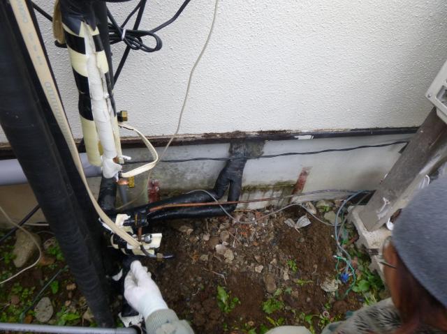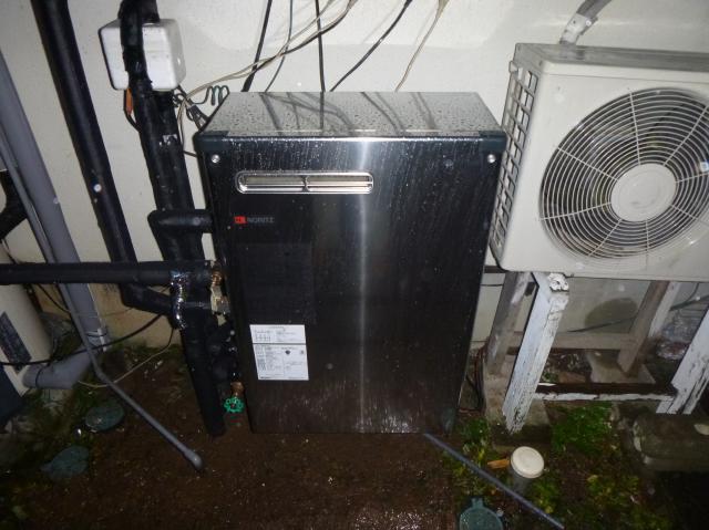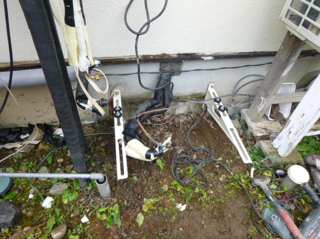 | 新しいブラケット架台の取り付けをします。 | 新しい、太陽熱温水器対応の石油ふろ給湯器を設置します。 | 配管を接続します。お客様のご要望で水栓も取付け、保温巻を進めます。この頃から雨です、天気予報が当たりました。 |