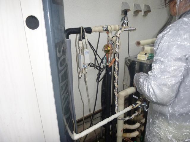 | 某メーカーの太陽熱温水器が接続された石油給湯器の調子が悪くなりました。 | あまり小型の給湯器でしたのでびっくりしました。直圧式の給湯器かと思ってしまいました。 | でも、配管は複雑です。 |