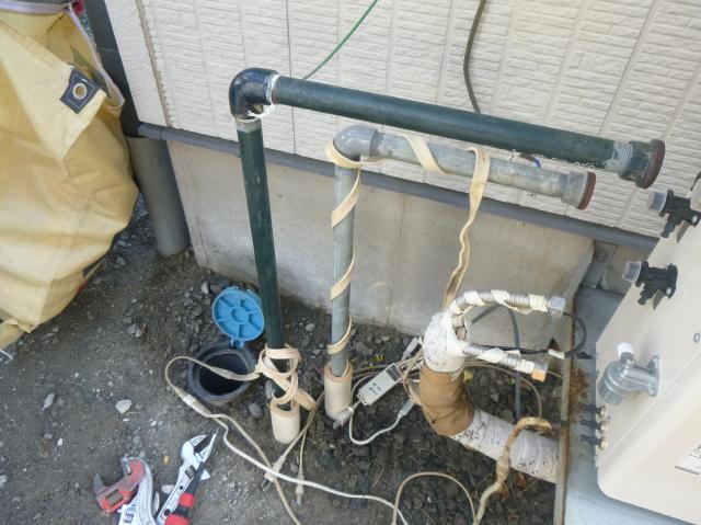 | 同じメーカーのものを使っても、接続位置が違っています。 | 給水・給湯・ふろ循環・石油それぞれの管を接続します。 | 保温をして、化粧テープを巻いて完了です。 |