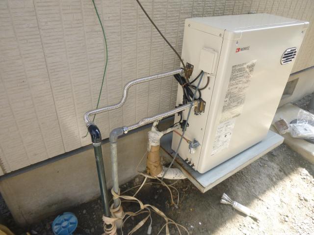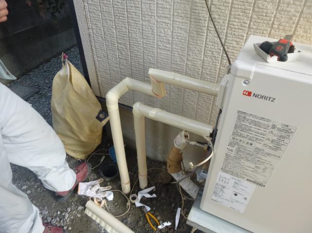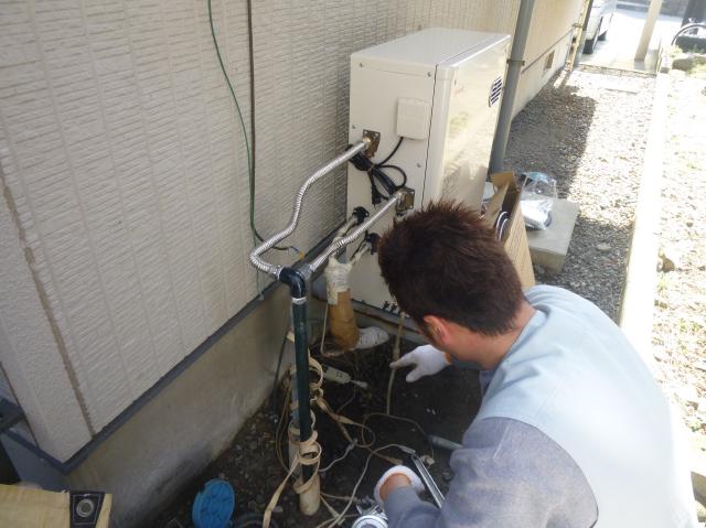 | 配管を切り離して、撤去完了です。 | 新しい給湯機をセットします。 | 配管の再接続をしていきます。 |