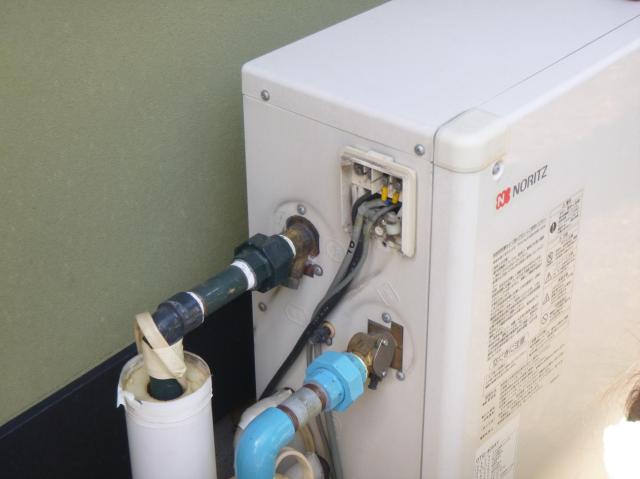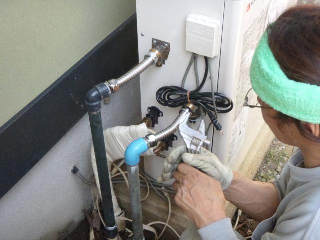 | 追い炊き用の循環配管を接続します。 | 水とお湯の接続配管の位置が給湯器よりも高い位置にありますので、いったん外して短くします。 | 短くしてから、フレキ管(銀色の管)をつなげ、ノーリツ給湯器に接続します。 |