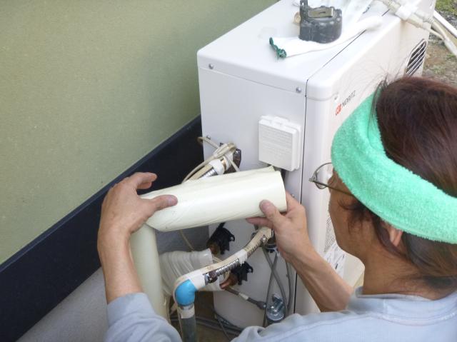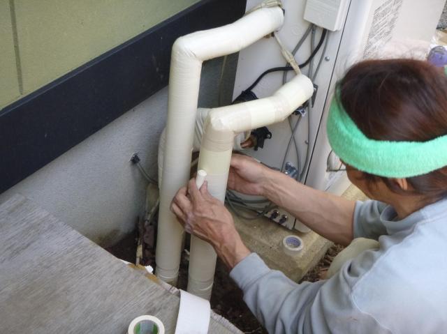 | 新しい保温材を巻いていきます。 | 最後に化粧テープで仕上げをしていきます。 | 完成です。 |