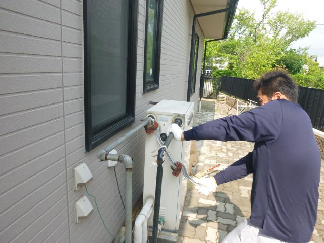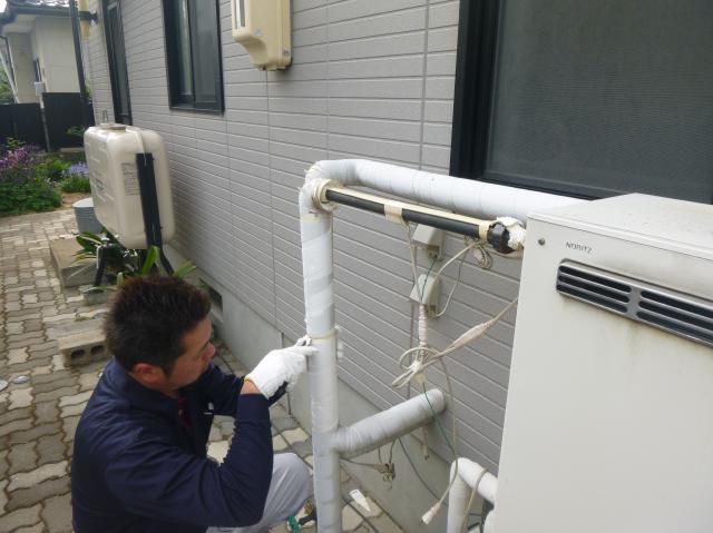 化粧テープも劣化して、触るとぼろぼろと落ちてしまいます。 | パイプが何度も曲がっているので、化粧テープを巻くの少し時間がかかります。それでもお仕事はとても速かったです。 |