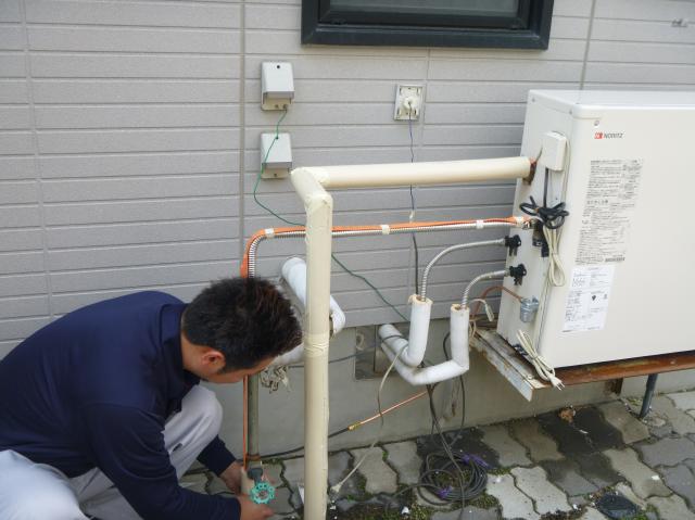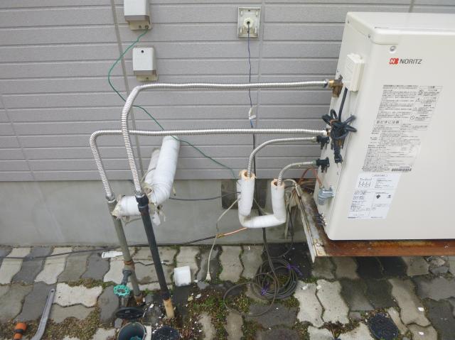 | 新しくやってきました、ノーリツの直圧式給湯器です。貯湯式とは違い、コンパクトです。 | フレキ管をつないでいきます。フレキ管は軽くて、ステンレスでできています。 | 石油管です。しっかり空気を抜かないと石油は入ってきてくれません。 |