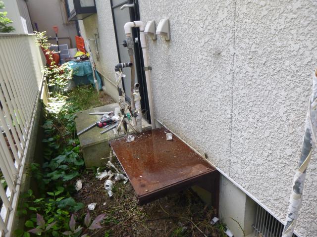 | 古くなったガス給湯器を取り外しました。 台はまだ使えますので既存のままです。 |