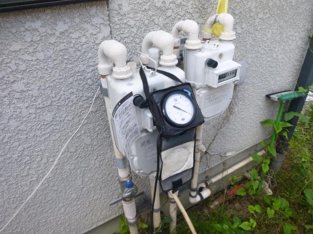ガスのパイプを替え終わったら、ガス漏れが無いか試験をしています。 |