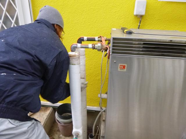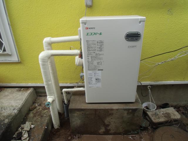 | 新しいノーリツ、エコフィール(高効率石油給湯器)です。 | 後ろもモルタルでしっかり埋め、保温材、ヒーター、 化粧テープでしっかりと施工しました。 |