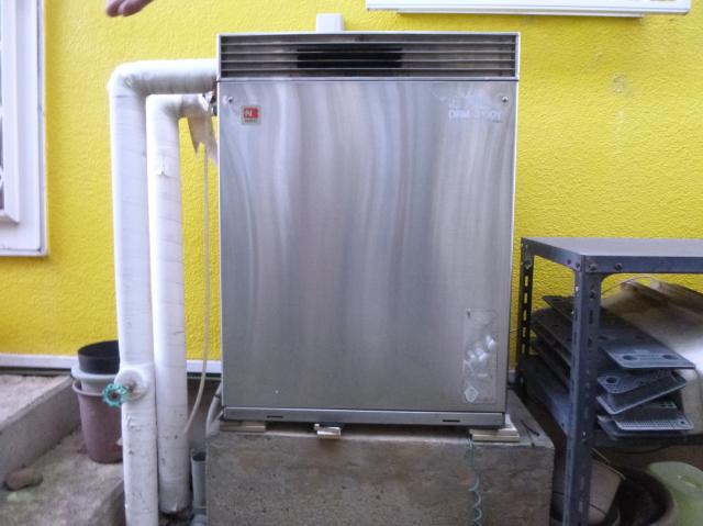 | ノーリツの今は製造されていないセミ貯湯式の隣接設置型のふろ給湯器です。 | 二つ、管が中へとつながっています。昔のお風呂には二つ穴が開いていて、その二つで循環などを行っていました。 | 二つ管があるのが分かります。 もうこの型は無いので、一つ塞ぎます。 |