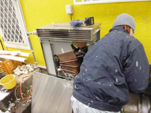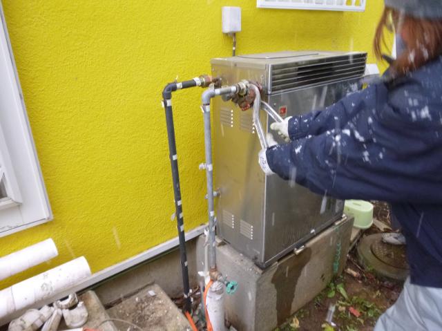 ちょうどその日は、早めの雪が降り周囲は真っ白に積もっていました。とても寒い日でした。機器の搬入や搬出を手伝いながら、写真を撮っていました。職人さんは防寒の支度がしっかりしていてさすがだなぁと思いました。 これで今日から暖かいお風呂に入ることができます。一安心! |