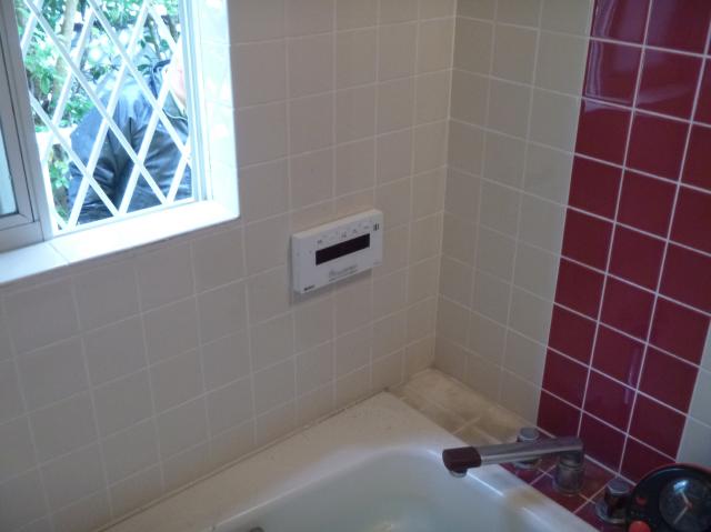 | 鉄管にフレキ管を繋いで、給湯器に接続します。 | 台所にもリモコンを設置するので、古いリモコンは撤去です。 | 新しいリモコンの設置完了です。 |