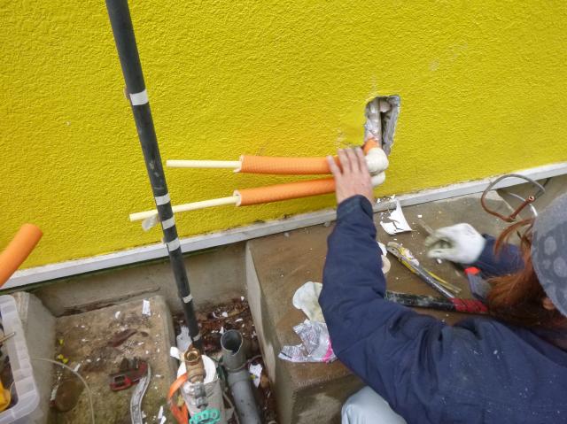 | 新しいリモコンもつけました。 | 管を給湯器に接続するために管をまげて行きます。 | 接続するのは左側です。 |