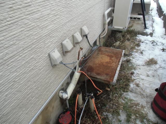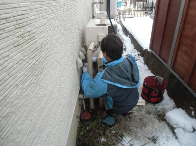 | 給湯器の取替えリフォームが完了しました。 | 水道の管には新しい保温材、ヒーターもしっかり巻きつけ、凍結対策もばっちりです。 | 給湯器の寿命は、大体15年ほど。「お湯が出ない」「シャワーの出が悪い」など違和感を感じたら、ぜひお問い合わせを! |