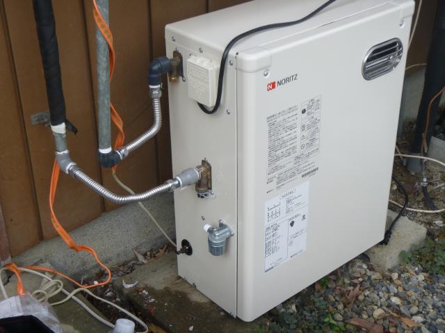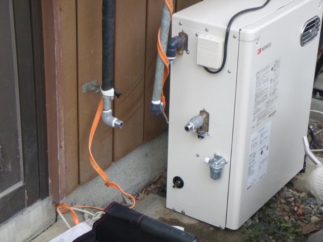 | ノーリツのオートストップ付給湯専用機の取り付けの完了です。 | キャンバステープを巻きなおして廻りの配管もきれいにすっきりしました。 |