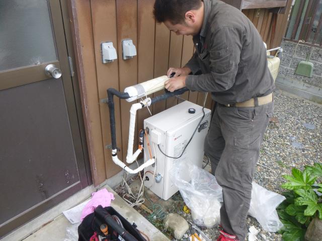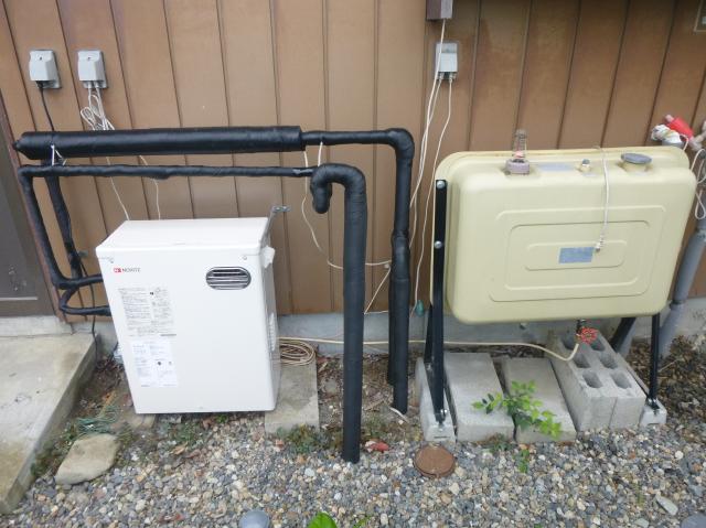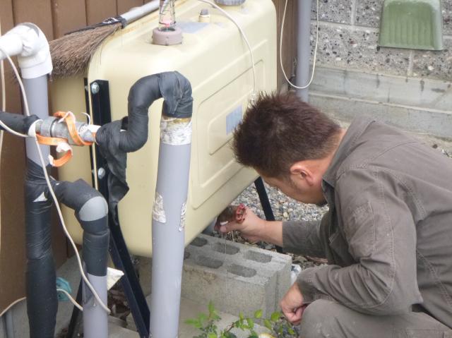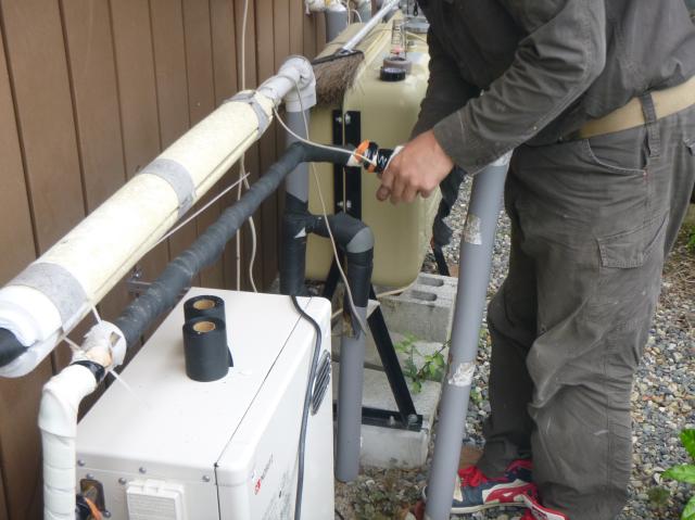 | 途中給湯機から離れた場所からの水漏れを発見し、保温テープを剥がし修理しました。 | 次はオイルタンクとの接続です。 |