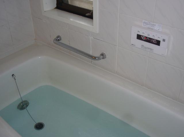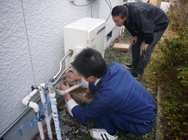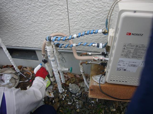 | 水とお湯の配管の他に、ふろ循環パイプの接続をします。 | 都市ガス管を、新しい強化ホースに取り替えて、ガス漏れがないかチェックしています。 | 新しいメタルのサーモスタット付きのTOTOシャワー水栓に交換しました。 |