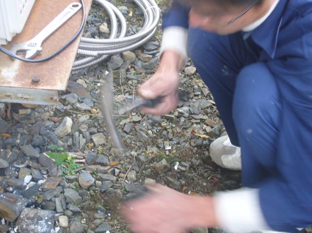 | 今までの給湯器の接続配管を外して、本体を撤去します。 | 切り離した配管を、新しいノーリツの給湯器に接続します。 | 接続するフレキ管に、ツバを付けるための加工をしています。 |