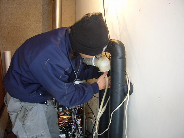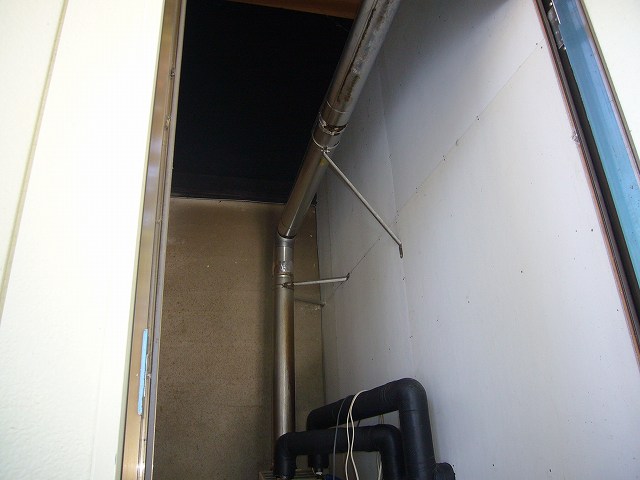 | 屋内設置式の強制排気型 石油給湯器です。 | 給湯器上部に給気口が付いています。 | 煙突の勾配が逆のようで、今回調整いたします。 |