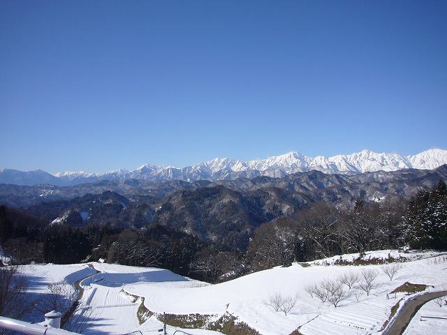 | 配管の接続、保温工事、リモコンの取付を終了し、試運転をして完了です。 | 工事に伺った日は、あいにく雪降りの日でした。この後、大雪になりました。 | 天気のいい日の小川村は、信州自然百選に選ばれているだけあって、北アルプスが一望できます。 |