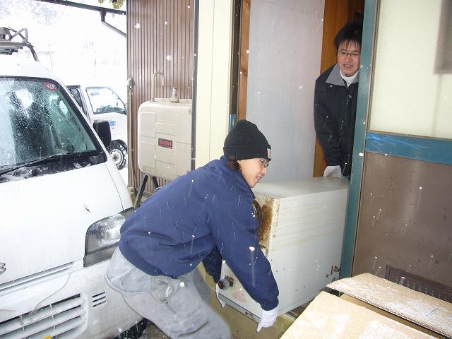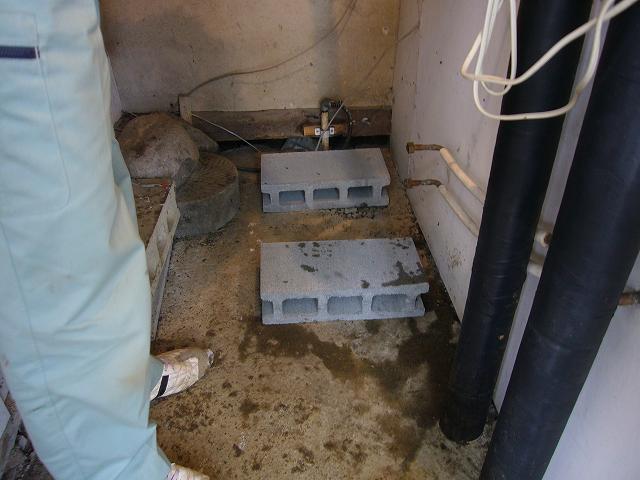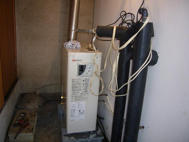 | 既存の給湯器をの周囲の保温や、配管を取り外して搬出します。 | 今までの物と、新しいものでは高さが11㎝違うので、基礎にコンクリートブロックを敷きます。 | 新しい、強制排気形の石油ふろ給湯器です。 |