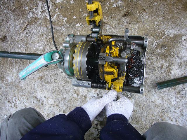 | 予定位置に設置して、これから配管のつなぎを行っていきます。 | 移動式の小型ネジ切り機です。 これを使って鉄管の切断・ネジ切りをします。 |