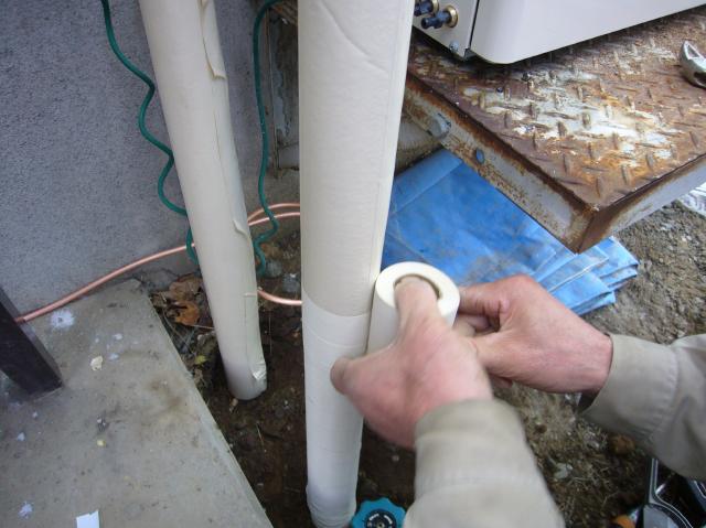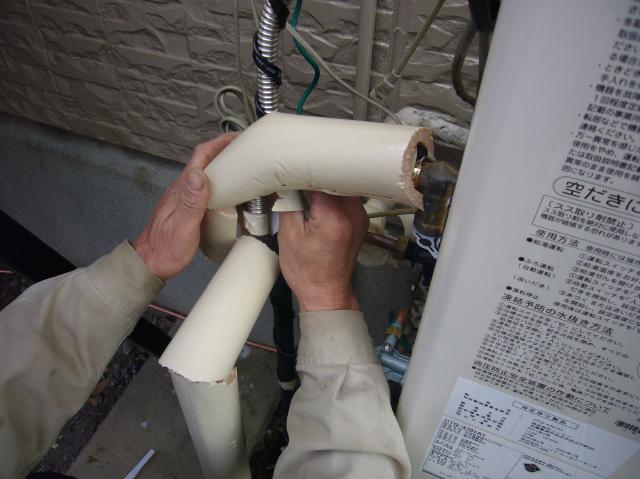 | オート機能が使えなくなってしまいました。 | 保温材を剥いで、給水管を露出させます。 | 給水・給湯管を露出させました。 |