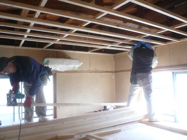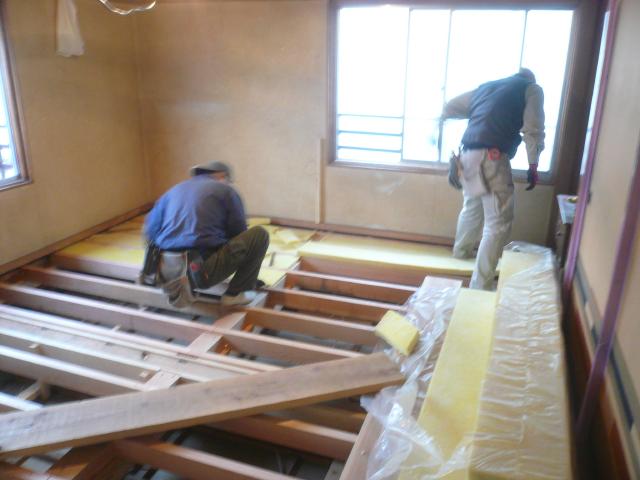 | 梁を補強するために、既存の梁の両側に新規に合わせ梁を取付ます。これで以前より床全体の剛性が出ます。 | 床の不陸を見ながら、根太を固定していきます。足場が悪いので、足場板を並べながら作業します。 | 根太を固定したら、根太の間に床用の断熱材を充填していきます。 |
