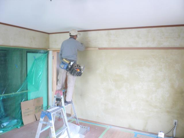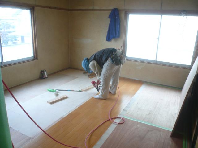 | リビングになる部屋の床のフローリングを張っていきます。張り終わった所から、傷や汚れを付けない為にベニヤで養生をします。 | 木工事が終わったので次jは内装工事になります。壁は繊維壁を濡らして剥がします。剥がすのも一苦労です。 | 繊維壁が剥がし終わったら、プライマーを塗り、全面をパテで仕上げていきます。 |