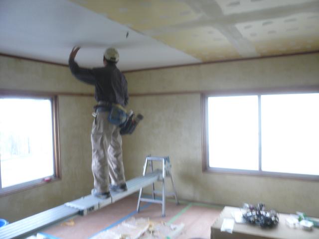 | 床の下地合板を張っていきます。足場が良くなったら次の工程に移ります。 | 片側の床が張り終わったので、隣のもう1部屋分の床の下地材を搬入します。 | フローリングを張る前に、先に天井を下地を組んで、天井を張っていきます。 |