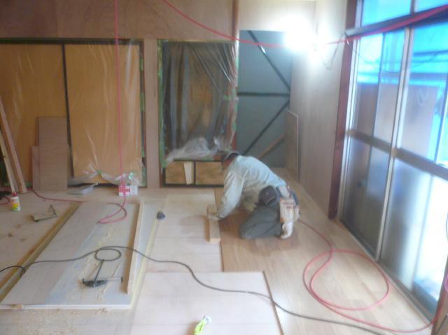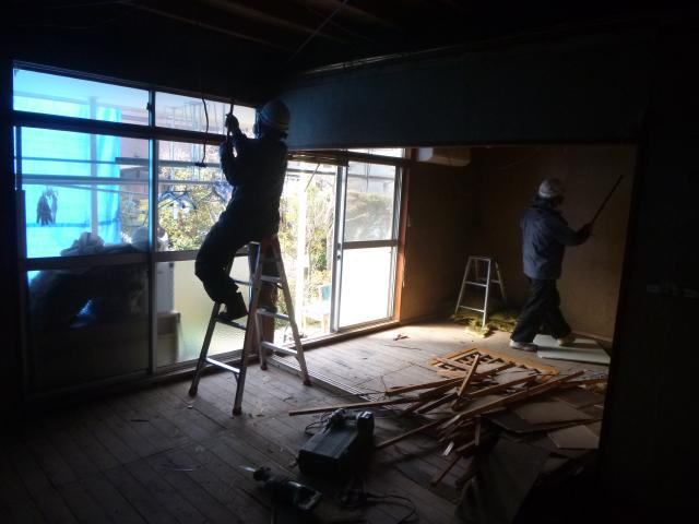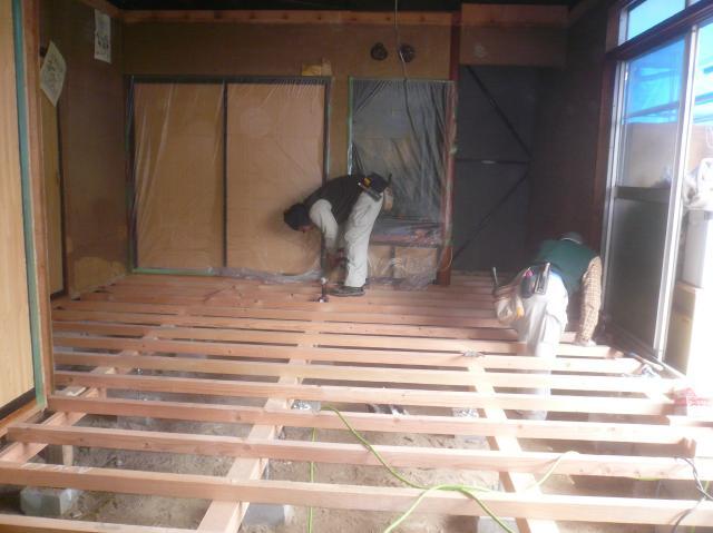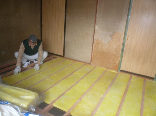 | 解体屋さんの作業です。天井を壊しています。 | 大工さんに床を組んでもらいます。大引と根太を組んでいます。 | 床の合板を張る前に断熱材の充填をします。 |