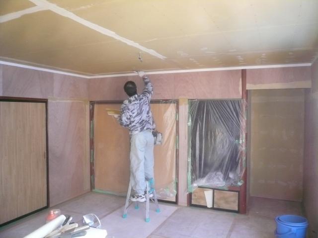 | 合板を張り終えたら、足場を組んで天井の下地を組みます。 | 天井を張り終えたらフローリングを張っていきます。 | 内装屋さんにクロスを貼ってもらいます。その前に下地処理を行います。 |