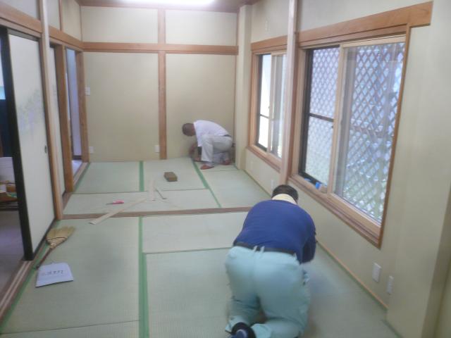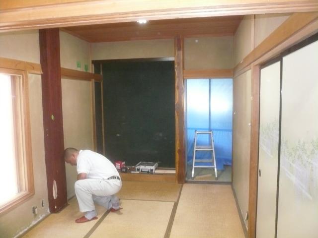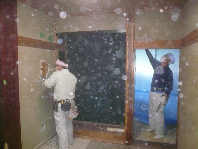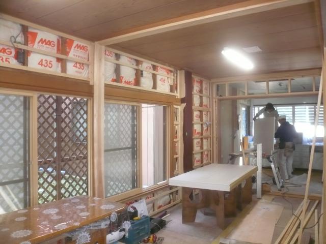 | 畳を撤去して、新しいものに換えます。 | 古い内壁を壊していきます。床の間も壊して、台所との仕切りを無くします。 | 壁の下地を組んでいきます。 |