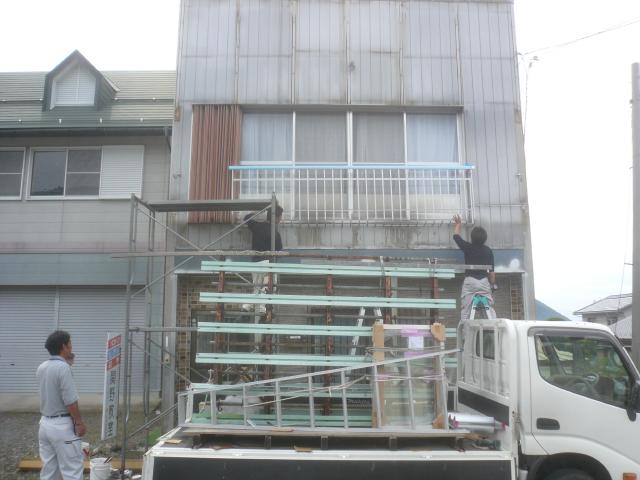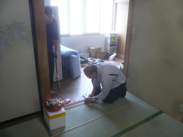 | 畳屋さんに新しい畳を張り替えてもらいます。 | 建具屋さんに建具の調節をしてもらいます。写真では敷居を削っています。 | 昔の看板をはずして、手摺を取り付けました。 |