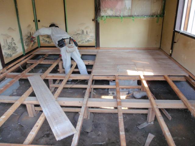 | ボロボロになった床は恥ずかしいというので、交わしたところから掲載です。 大引から全て取替です。 |