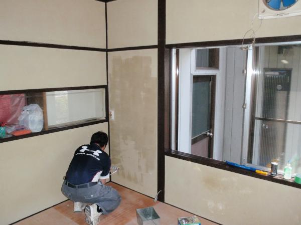 だいぶ昔に、お父さんが塗ってしまったという和室の柱、もう一度塗り直して、民芸調にします! |