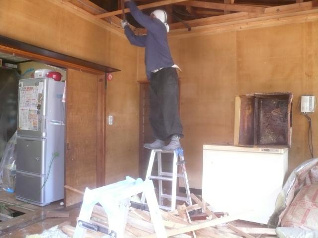 | 流し台はもう一度使うので取り外して壁、床を撤去していきます。 | リビングの天井を壊していきます。 |