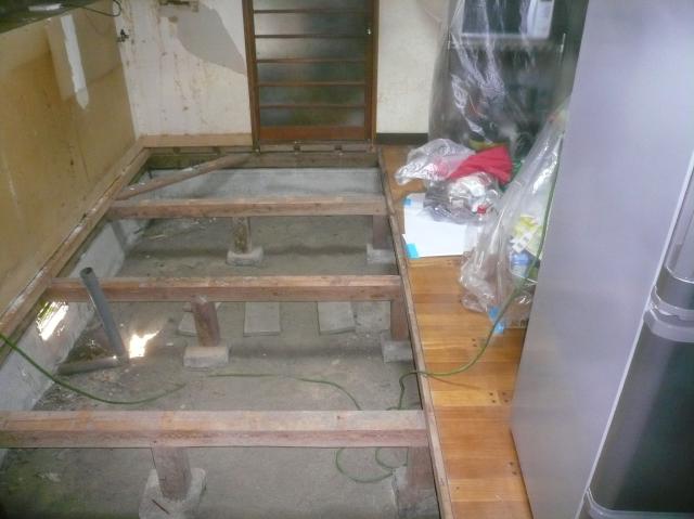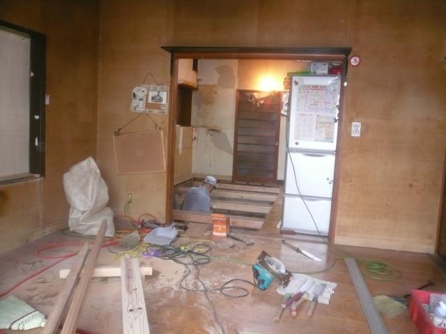 | 大工さんに床を作ってもらいます。 | 床に断熱材を充填していきます。その後に床を作っていきます。 | 新しく枠と換気扇を付ける作業をしています。 |