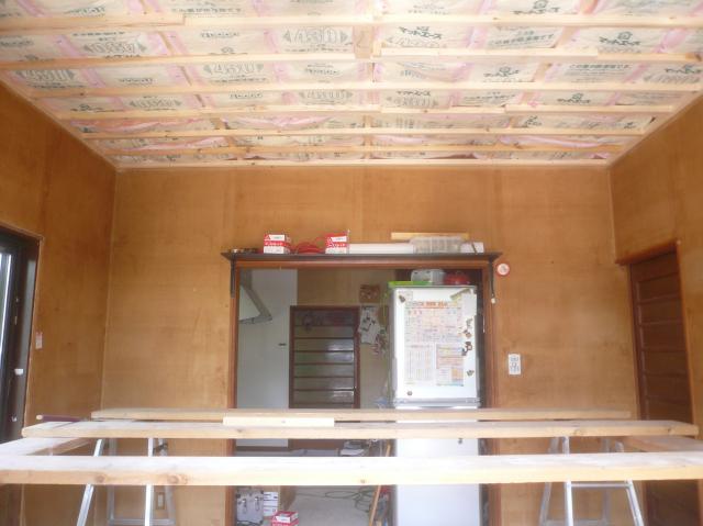 | リビングの天井に断熱材を充填していきます。 | 断熱材を入れ終えました。 | 断熱材を入れ、天井に石膏ボードを貼ります。 |