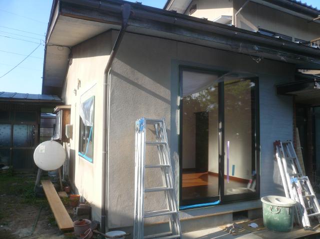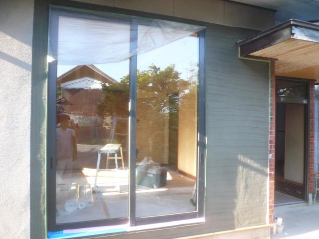 | 新しい窓枠を入れました。 | 左官屋さんに窓を付ける際に撤去したモルタルの修復をしてもらいます。 | もるたるで仕上げてもらいました。 |