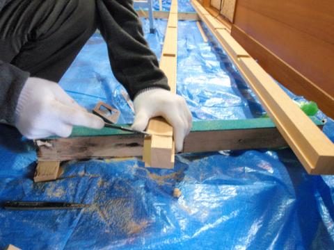 築30年の家、回りの造作材はラワンを使っています。今は希少価値の高価な材料になってしまいすぐには間に合わないので、一番似ているメルサワを使用。 | 和室の廻り縁を取り付ける仕口の現場加工です。さすが腕の良い太一師匠!わずか1時間足らずで加工してしまいましたが、この技術解ってもらえるでしょうか? |