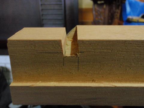 | ノミで加工する溝も、ただ突き払ってしまうのでは無く、もし木が乾燥して縮んでも隙間が出来ないように工夫されているのです。 | これなら解るでしょうか? 小穴(溝)の断面です、差し込み穴を斜めにすることで、隙間が空かないように工夫されています。 |