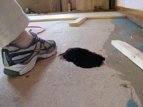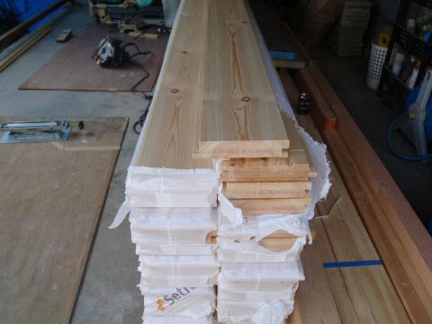 一番下はパーチクルボードと言って、木のチップを圧縮して接着しています。歩いているだけで踏み抜いてしまいました。 | 震災の影響でしょうか、遅れていた床材が、やっと入荷しました。 厚みは31mmずっしりとした重量感があります。 |