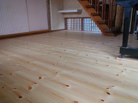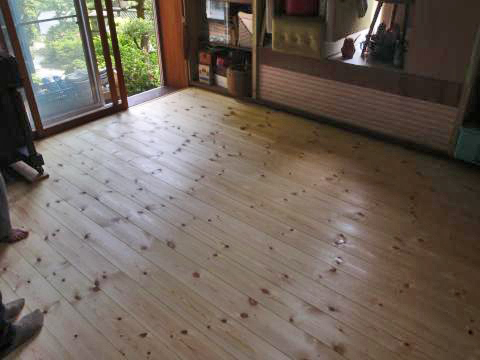 | 一枚物で張り仕上げて行くため、ここは棟梁の腕の見せ所です。 | 材種はレッドパインと言って、松系のフローリングです。スェーデンからの輸入品で、Setra社製です。 | 張り仕上がりを待って、すぐに自然塗料を塗ります。今回はユーロを塗装、臭いも少なくシックハウス対策塗料です。 |