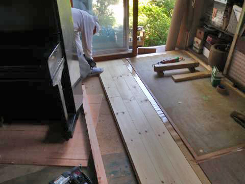 | いよいよ着工です。パンチカーペットの剥ぎ取りから。下地の板が見えてきました。 この上に床板を張る予定です。 |