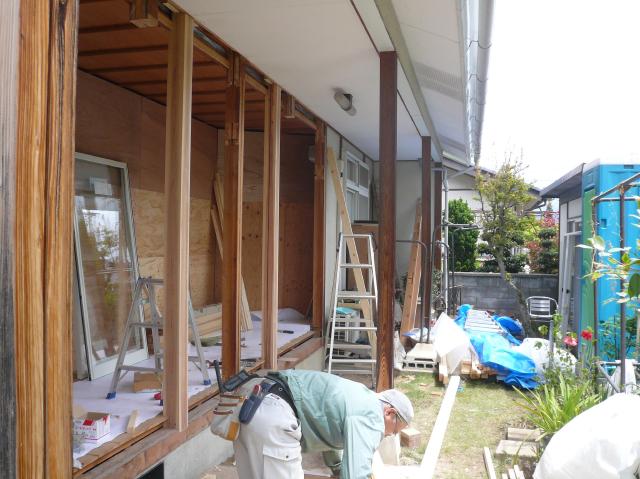| 補強する箇所にまずは柱を建てます。軒天も壊さないので細かい作業になります。 | 新しく建てた柱に筋交いを設置して、新しいサッシを取り付けます。 | 今回は筋交いの他に外壁面は、構造用合板の12mmも張ります。 |