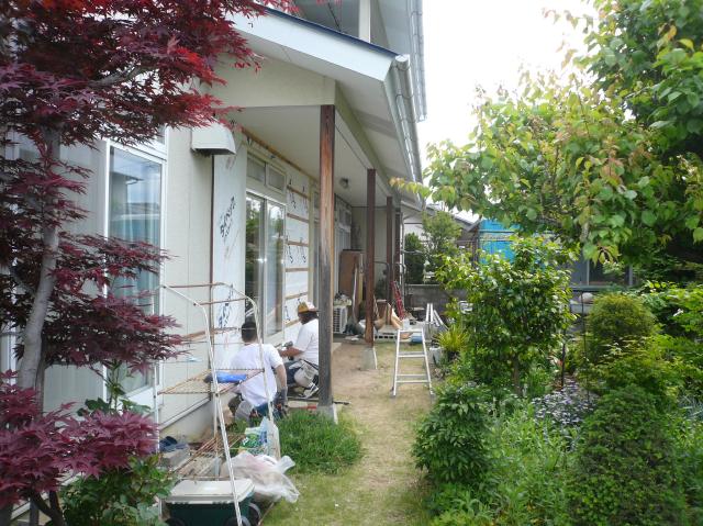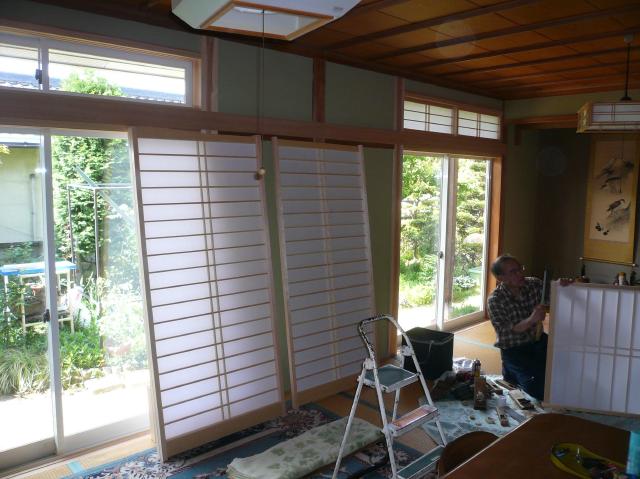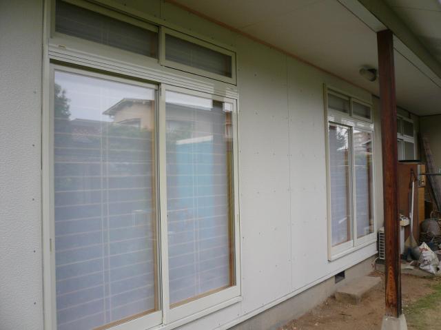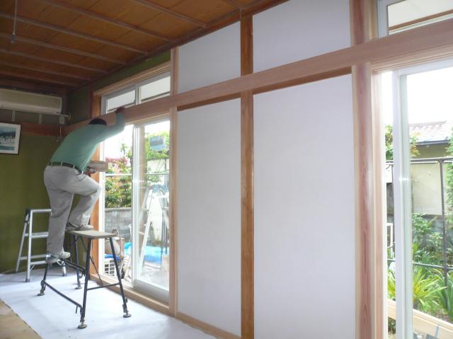 | 既存の聚楽壁と、一番近い色を選び仕上げをしました。時間が経ってるので同じ色には仕上がりませんが、自然と馴染みます。 | 既存の障子は寸法が合わないので、新規に障子を製作しました。建具を削って建付を調整します。 | 外壁のサイディングを張ります。既存のサイディングと同じものは無いので、一番近いものをこれから張っていきます。 |